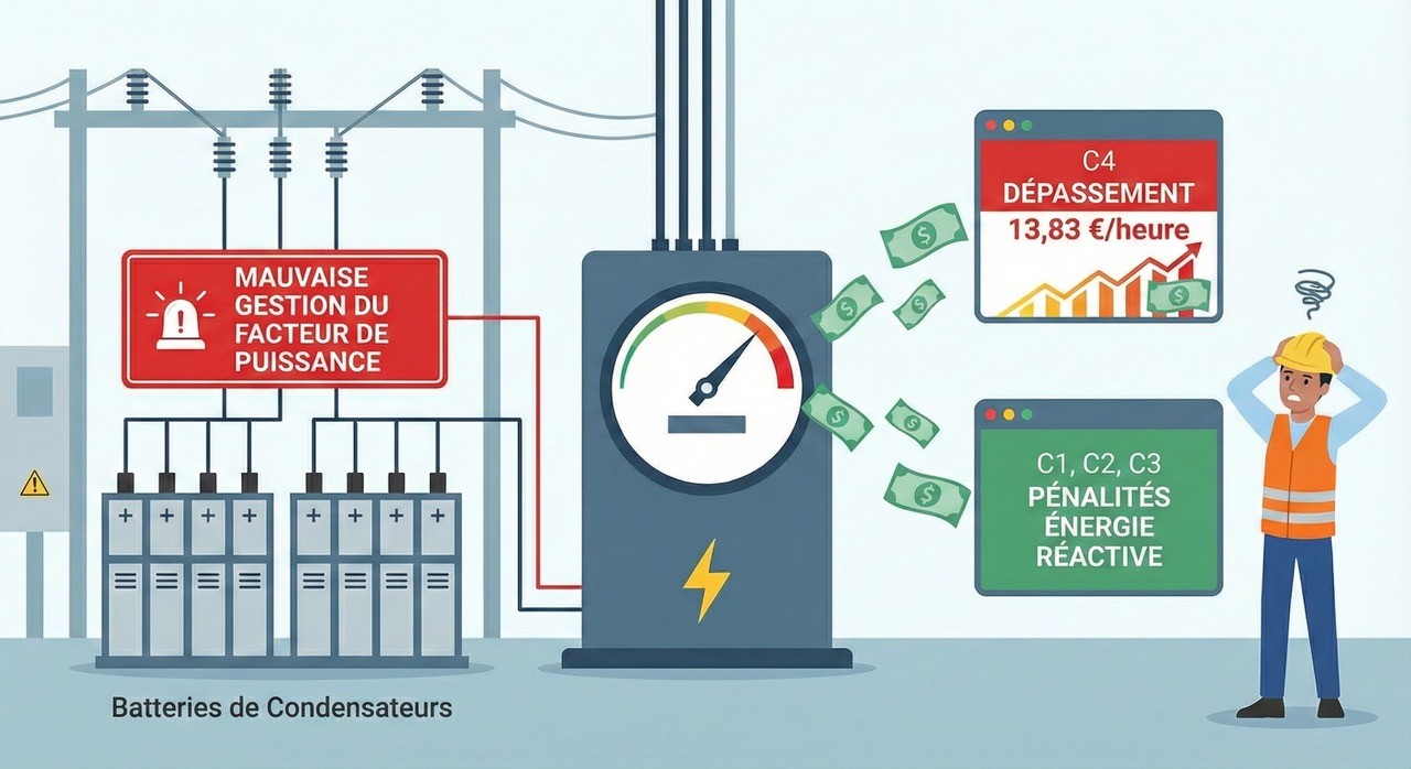 Pour les sites équipés de batteries de condensateurs, une méconnaissance ou une mauvaise gestion du facteur de puissance peut entraîner des frais pour dépassements de puissance souscrite (13,83 €/heure) dans le cadre des contrats «tarifs jaunes». Dans le cas des contrats «tarif vert», cela peut conduire à la réapparition de pénalités sur l’énergie réactive.