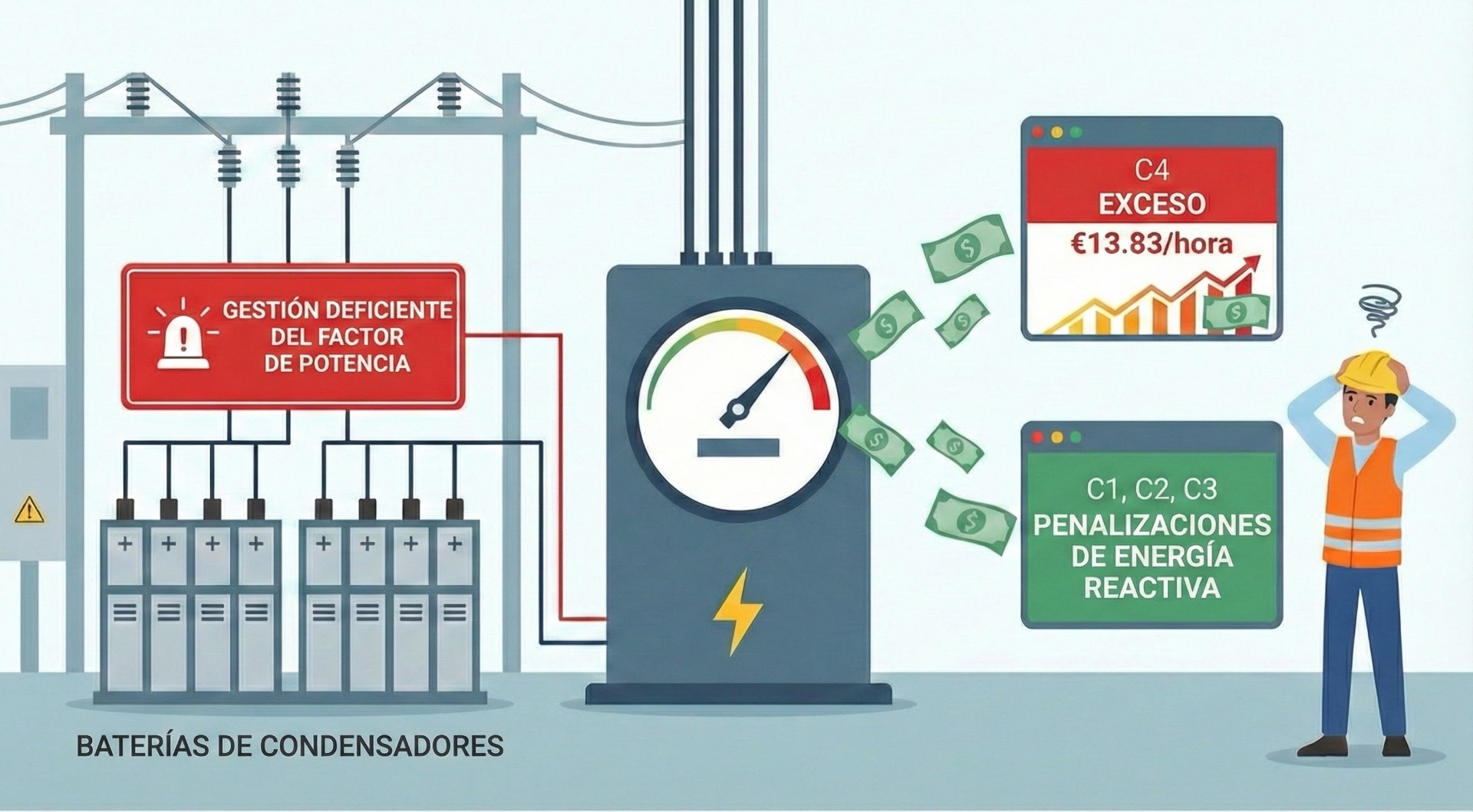 Para los sitios equipados con bancos de condensadores, la ignorancia o la mala gestión del factor de potencia puede llevar a cargos por exceder la potencia suscrita (13.83 €/hora) en el marco de los contratos « tarifas amarillas ». En el caso de los contratos « tarifa verde », esto puede llevar a la reaparición de penalizaciones por energía reactiva.